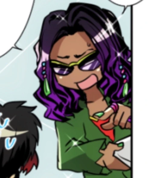 Burogu is a man with brown skin and hair that goes past his shoulders, black at the roots and turning purple at the tips. A section on either side of his hair has been separated using four small spherical hair beads, and one large bright green one. His eyes are covered by sunglasses with dark purple lenses and bright green frames. He wears a green prison jumpsuit with a red shirt visible underneath. His hands have purple rings on them, and his fingernails are painted mint green.
