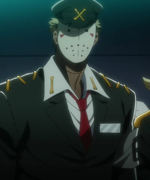 Damian's Nanba uniform is standard with its basic black hat, coat with a name tag on the left breast, white dress shirt, red necktie, black pants, and boots. Two gold bones form an "X" on the front of his cap, as well as one gold bone on both sides of the white dress shirt. Keeping with the Frankenstein theme, the seams of the jacket are lined with larger stitching. The gold ornamentation on his shoulders is also reminiscent of gold stitches.