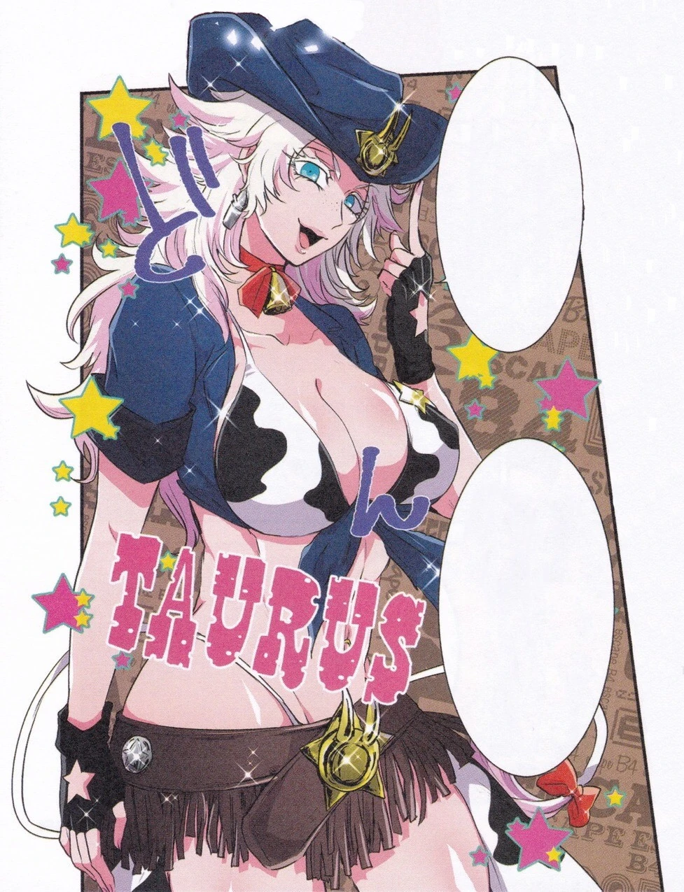 In the more recent chapters, her cowboy hat is now black instead of blue, adorned with a red band and a silver medallion of the zodiac sign she was based off, Taurus, in the middle. She wears a brown & black crop-top style jacket adorned with silver studs, and a red belt with a buckle that matches the medallion on her hat. Her pants have a similar cut to the one in her previous outfit, only now the cow print is replaced with all brown, decorated with fringes on the sides and silver studs. She appears to not wear a white thong anymore, and her black fingerless gloves no longer have the star-shaped holes on the back (most likely because it is implied that she is no longer part of the Zodiac Police[1]). The ribbon around her neck is a darker shade of red, with the ribbon now tied on the side with no cowbell. She still wears a cow print bra and black short shorts.