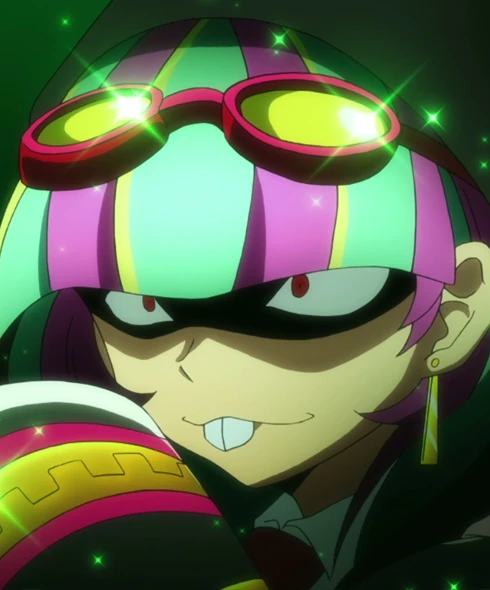 Tomato is a youthful-looking man[6] of below-average height, despite the fact that he claims he is well over the age of 30. He has red eyes and buck teeth resembling that of a rabbit. His hair is shoulder-length and contains green, pink, and yellow streaks, with front bangs long enough to cover his eyebrows. On top of his head sits a pair of round goggles with red frames and yellow lenses. He also wears yellow earrings.
